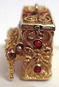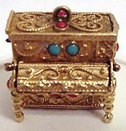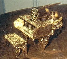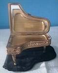 This is a very finely cut brass filigree-style piano with a matching bench. It measures 1 1/2" across by 2" high. The top opens and closes and the piano is gold plated so it will not tarnish. The picture on the left is of mine; the one on the right shows an identical piano with a clearer image. |