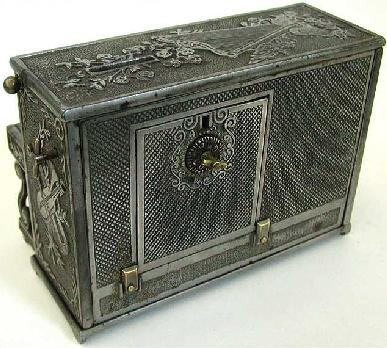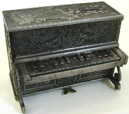 This is a super-rare 5 1/2" high cast iron piano still bank that plays music. Only a few are known to exist. |