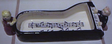 This ceramic piece is a cracker tray featuring a cat playing the piano and a lady singer or admirer. It is stamped on the back "Cardinal Ind. 1993." The piece measures 10" long and 2 1/2" high. |