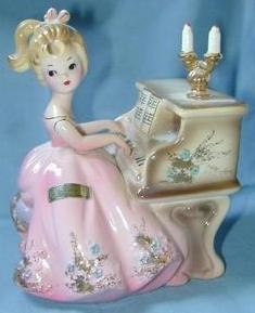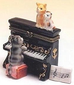 On the left is a ceramic Josef Originals figurine, marked as such on the bottom, along with a JAPAN sticker and a sticker identifying her as Tammy. The figurine features a girl playing a piano and is 5 1/2" high. It also comes as a musical version; the figurine revolves as the music box plays "Humeresque." On the right is a ceramic trinket box with cats around the piano that measures 2 1/2" across by 3 1/2" high. The sheet music is a separate piece. |