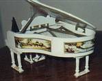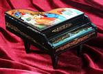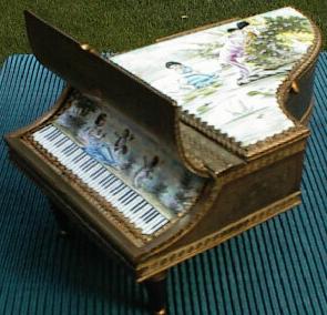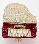 The gorgeous trinket box on the left is made primarily of metal, gold plated, with red and white epoxy coloring. It has 158 clear Austrian crystal stones. The top of the piano is removable and you can put small items in it. It has a magnetic closure. It measures 1 3/4" high by 2 1/2" long by 2 1/8" across and is quite heavy for its size. On the right is a musical Victorian miniature pianoforte and bench made in the 1" to 1' scale. It measures 4 3/4" across by 5 1/2" high with the lid open. |