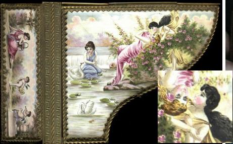This is a gorgeous antique Limoges casket or table box. There was one like it on the Antiques Roadshow that appraised for $2,000. This one was at one time a music box, but the box has been removed as it does not work. This piano has lots of details, including Greek key trim and hand scrolling inside. The lid and keyboard cover open to reveal more scrollwork. There is hand-painted porcelain on the top and over the piano keys. This heavy box measures about 6 1/2" long by 4 1/4" across by 3 1/2" high. |