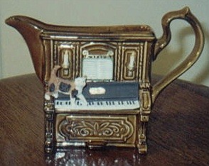 This is a brown ceramic upright piano creamer I bought in New Orleans. It measures 6" across by 4 1/2" high and features a cat walking on the piano's keyboard. |