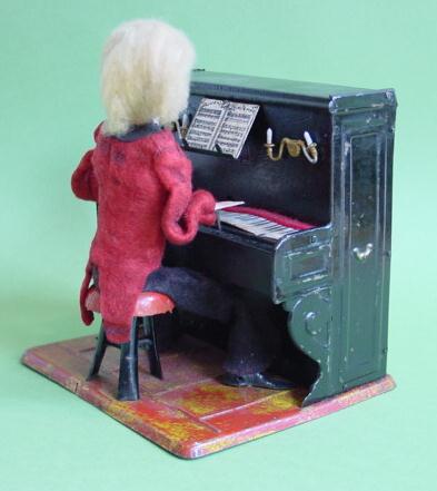 This piano player, called "Le Pianiste," is made by the famous toy company Fernand Martin of Paris in France. The antique toy is made of tin and cloth and was produced in 1901. The windup clockwork mechanical function is in working order: the hands will move along the keyboard producing the piano music, which sounds like a primitive music box. Martin toys are highly collectible and rare (and very expensive). The toy measures 6 1/4" long by 5 1/4" high. The pianist plays the keyboard to the air "J'ai du bon tabac" for the French market or "God Save the King" for the English or American market. It exists with or without hair. |