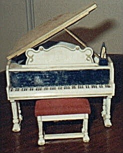 This is the Petite Princess plastic dollhouse piano by Ideal. The first picture is not of mine, but you can see the detail. The one I have is in need of cleaning, but is rare in that it still has its tiny metronome (which is easily lost because it's not attached!). The inside of the piano is detailed in relief with painted strings. The keyboard is also in relief. Behind the keyboard is a mirror-like panel. The piano has stickers around it and under the lid that depict old-fashioned pastoral scenes. The bench is covered in soft maroon fabric. This piano is made in Japan. It measures 3 1/4" across by 4" high. |