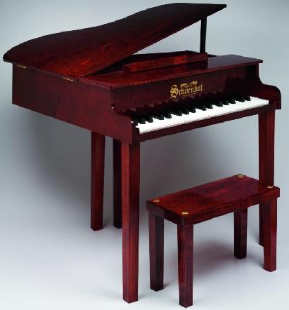 This is a new Schoenhut concert grand toy piano. Schoenhut toy pianos are authentic musical instruments. Small hammers strike metal rods, producing lovely chime-like tones. The keys are correctly spaced, corresponding to those on a big piano, enabling a child to learn proper "finger stretch" required for playing. This model of piano costs in the $350.00 range. |