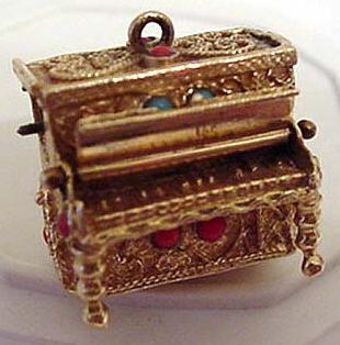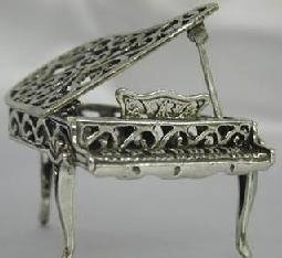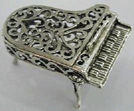 This sterling silver mini piano has filigree work all over. The top part opens and closes; it can also stay open with the help of a sterling stick. It measures 2" long and 1 1/2" across. |