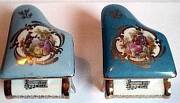 Here is a pair of Limoges piano trinket boxes in mint condition and with the standard Limoges Fragonard love scene. One is light blue and the other is dark blue. Both are matching in every other way. Each measures 3" by 2" by 1 1/2." |