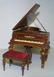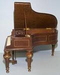 This ornate Bespaq walnut baby grand dollhouse piano has an opening and closing lid and music desk, detailed pedals and strings, gold-trimmed carved legs, and a stool. It is 3 1/2" high and across by 5 1/4" long. This miniature retails at $150.00. |