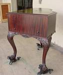 This amazing and unique piano-shaped desk is a late Victorian piece dating to the early 1900s. It is solid mahogany with hand carving. The auction listing said it was made from the body of a baby grand piano, converted into a desk by a master craftsman in the 1910s or 1920s. However, the desk measures 42" deep, 40" high, and 32 1/2" across, so its origin as a real piano is questionable. |