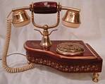 This wonderful vintage princess-style phone in the shape of a piano has a ceramic body. It is burgundy in color with gold decorations and brass details and measures 9 1/2" long by 9" high. |