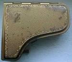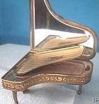 This is a wonderful grand piano metal powder compact that is now becoming scare and hard to find. The legs of the piano fold down and the compact slides into a little black satin piano-shaped bag for protection. The compact measures 2 3/4" long and stands 1 1/2" high. Inside the lid is a mirror and engraved on the powder guard is Pygmalion. Made In England. |