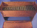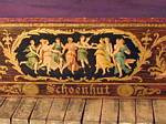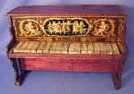 Here is an early Schoenhut toy piano with wonderful decoration. The colorful and vibrant transfer decal depicts a cherub with flutes on either end and a group of dancing Grecian women in a circle. The gold in the decal is embossed. There is a patent number on the decal, "September 18, 1900." The frame is constructed of cherry stained wood. This piano measures 11 1/4" high by 17" across by 8" deep. |