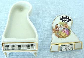 Here is a very classy porcelain mini piano pill box made by the Limoges company of Paris, France. There is a Limoges stamp on the bottom of the piece and the piano still has its original Limoges label on top as well. It was purchased in 1960. The piano is 2 3/8" long, 1" across, and 1 5/8" high. |